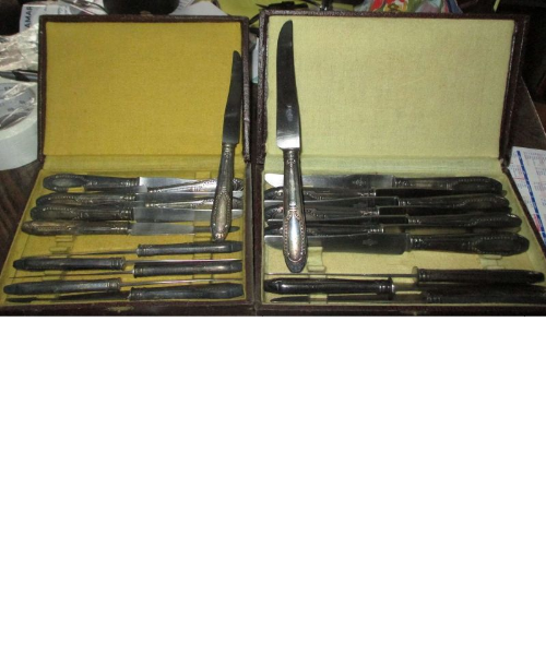12 Couteaux à fromage et 12 grands couteaux en métal argenté On y joint un service à découper