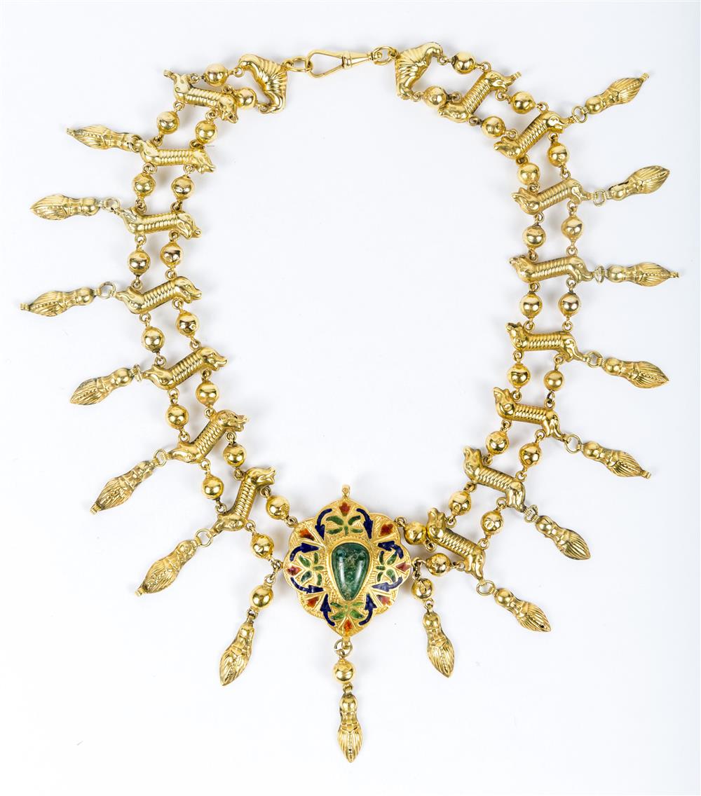 14K YELLOW GOLD, EMERALD, AND ENAMEL NECKLACE