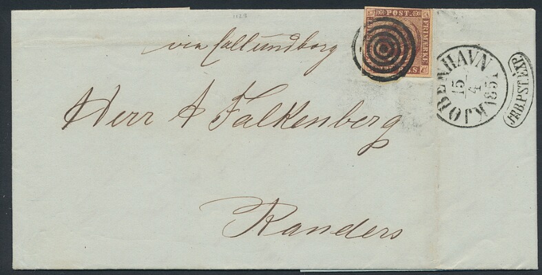 Plate II, nr.13. APRILLÆETTER from KJØBENHAVN 15.4.1851. to Randers. Lightly crease between the stamp.