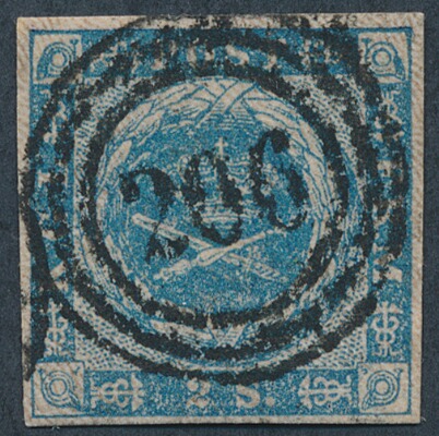 1854. 2 Sk. blue. Clear and upright numeral 206 (ELMSHORN ITZEHOE). Rare. Opinion Nielsen