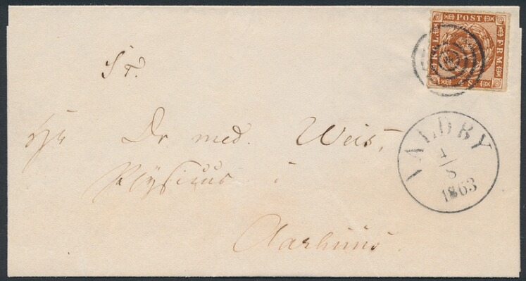 1863. 4 sk. Brown. SUPERB cover with MUTE CANC. Cert. Møller