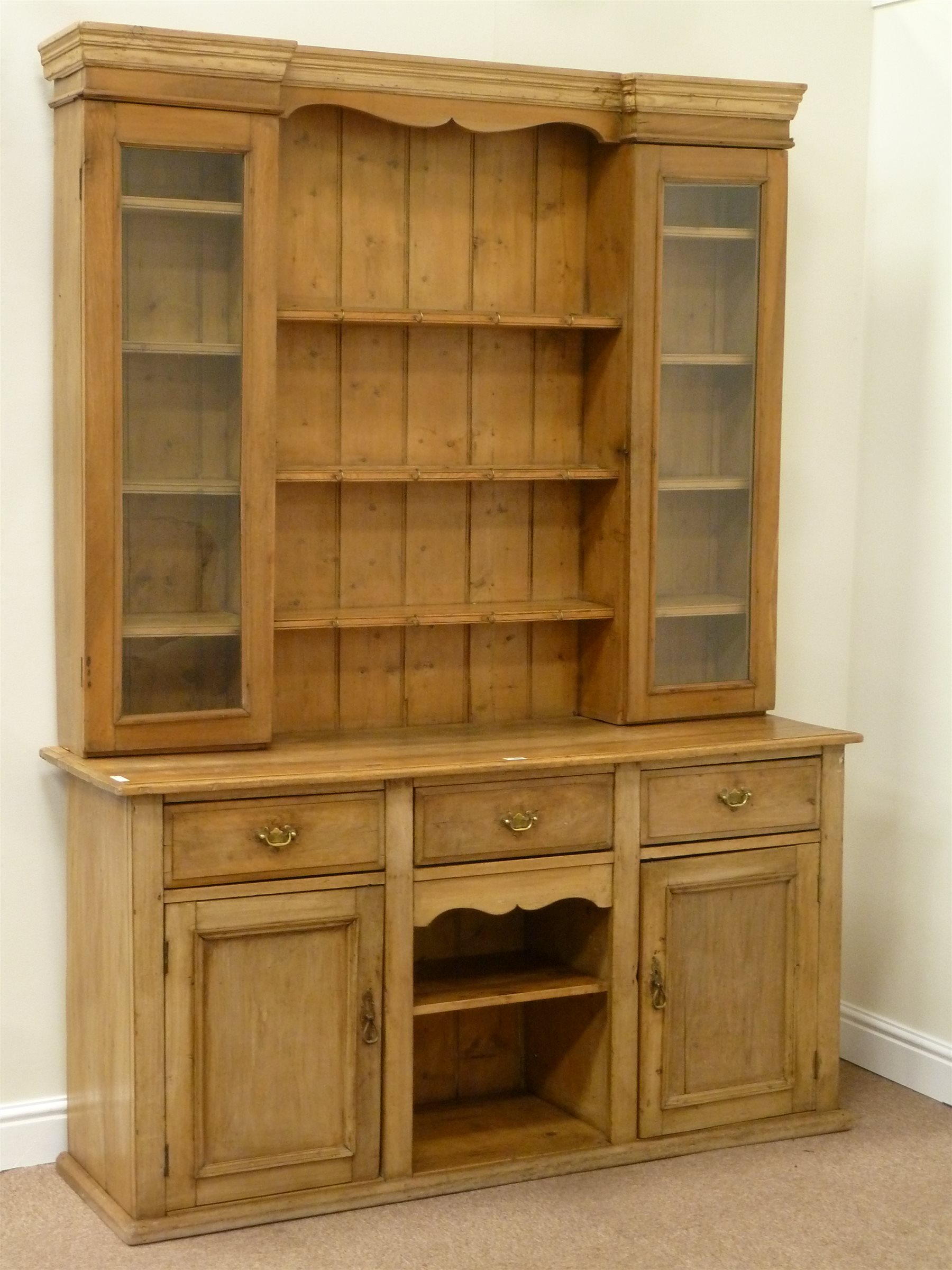 19th century pine dresser, two glazed display cabinets either side with three heights plate rack to the centre, on base fitted with thee drawers and two cupboards, W150cm, H204cm, D45cm