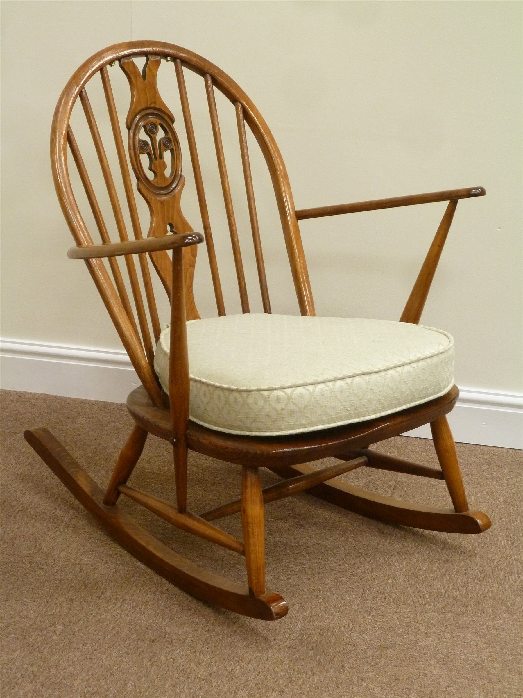 20th century hoop, stick and splat back beech and elm seat rocking chair with upholstered cushion