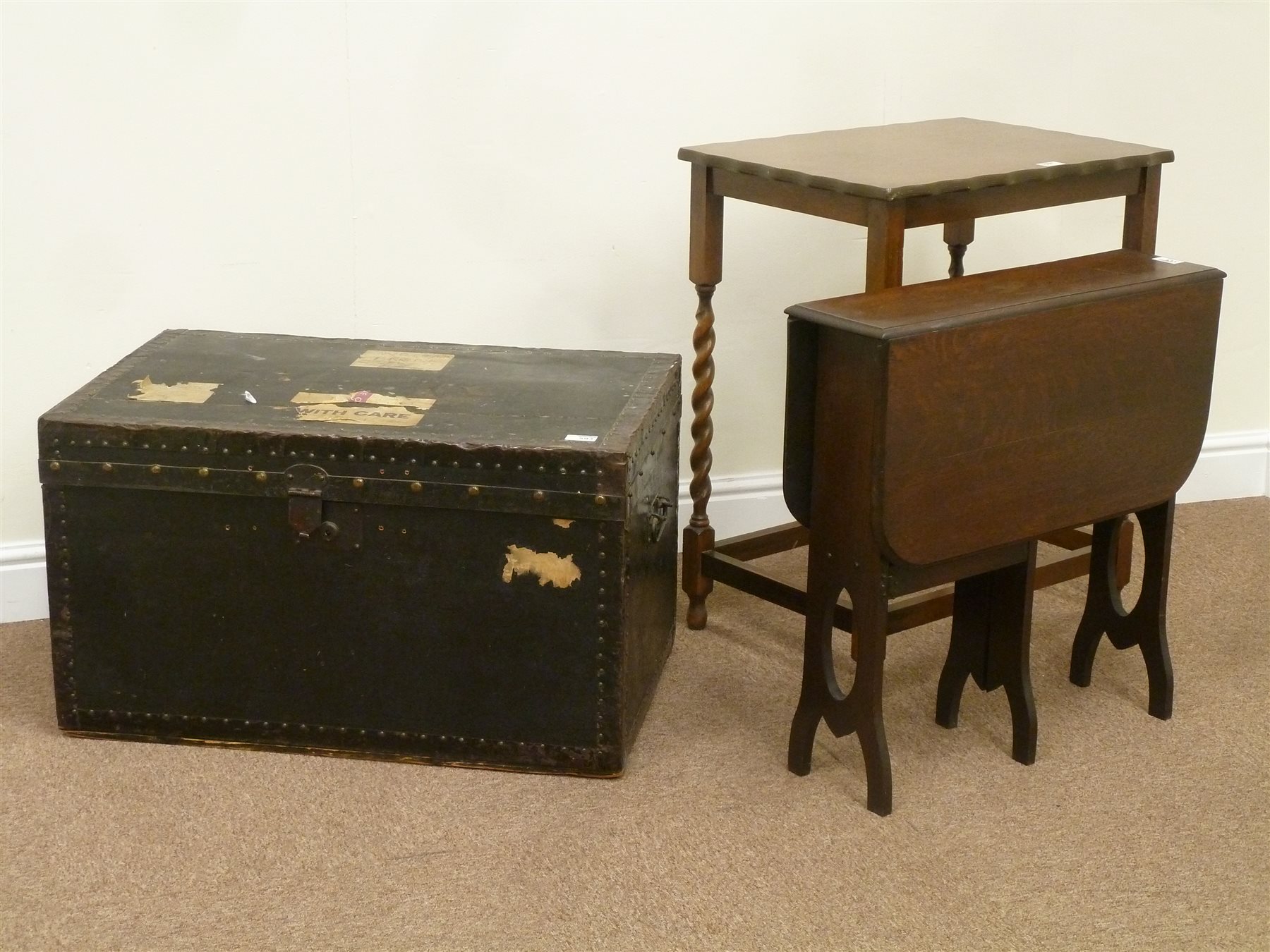 20th century wood and metal bound trunk fitted with hinged lid labelled W.J.Lovelace & Sons, Eastern style folding decorative tray top table (D60cm, H58cm), oak barley twist table and oak drop leaf table