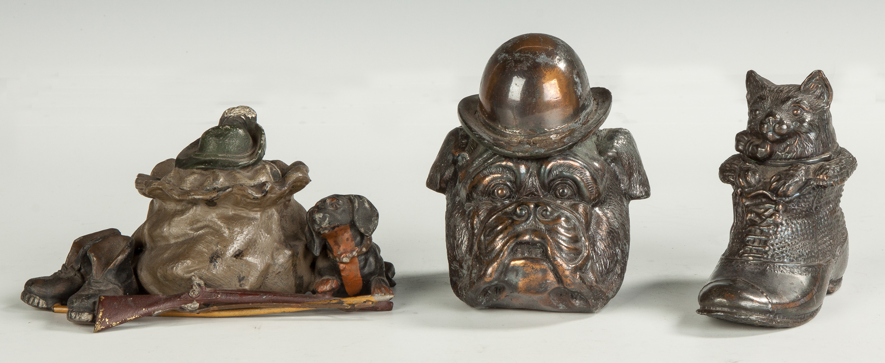 Early 20th cent. Hunting theme; Bulldog with top hat; Cat in shoe, porcelain liner is broken.