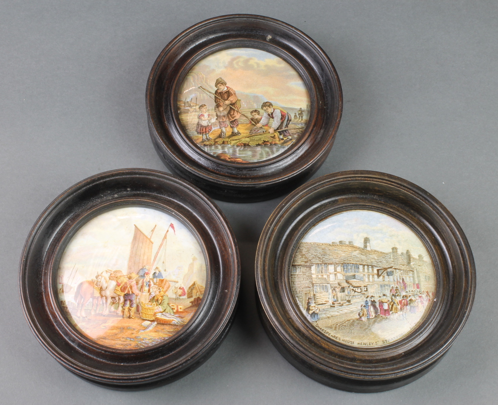 3 Victorian Prattware pot lids - Shakespeare's House, Henley Street, Stratford on Avon and 2 others, framed