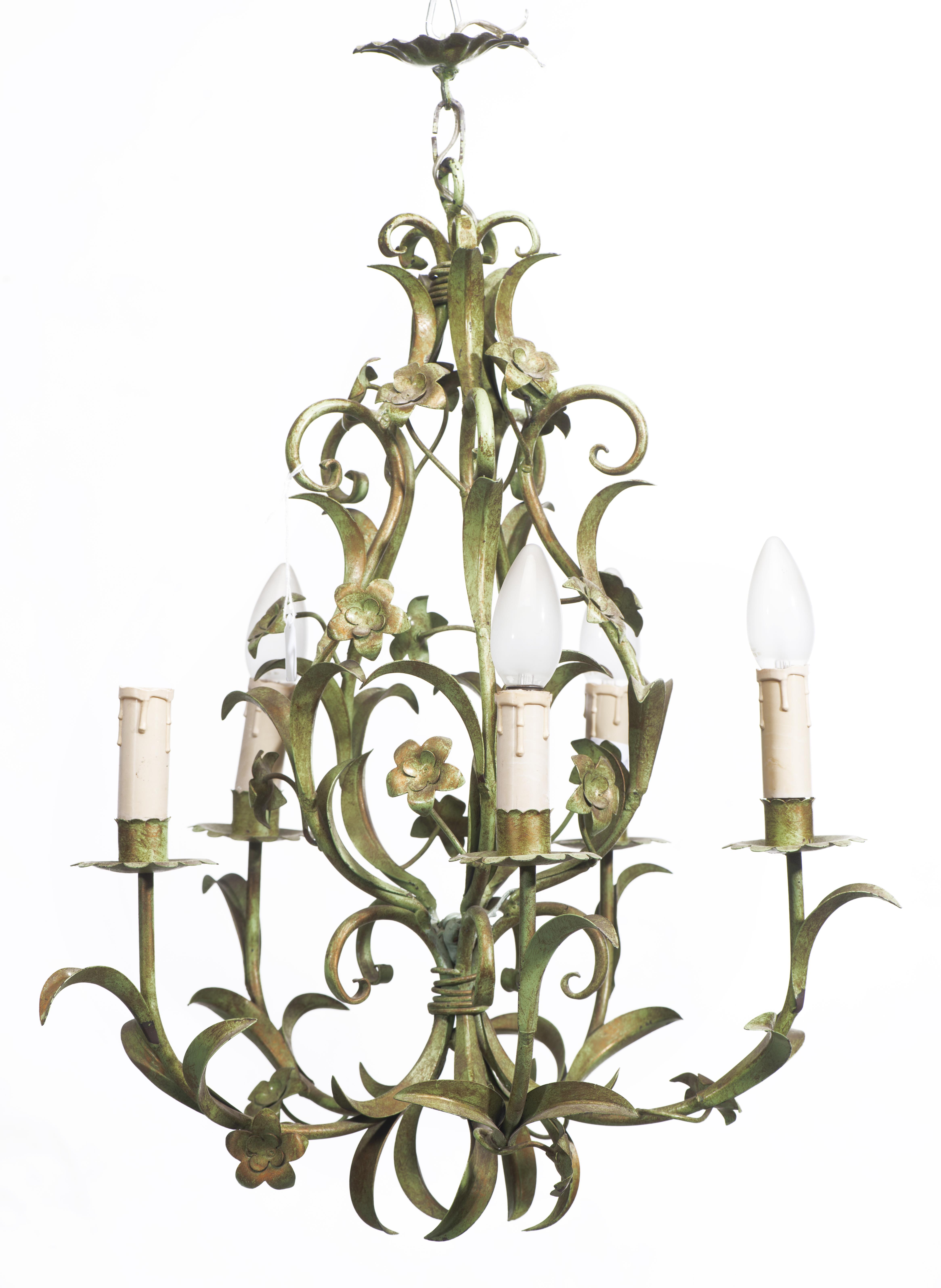 5-light chandelier wrought iron painted green decorated with leaves and flowers, electrified candles.