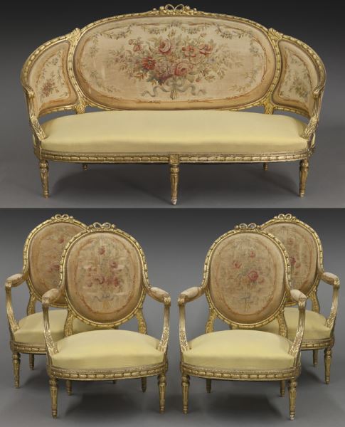 comprising: (4) armchairs and (1) settee with floral embroidered backrests over upholstered seats, joined by gilt wood arms with acanthus decoration, raised on tapered column legs. Chairs: 41.5"H x 28.75"W x 25"D; Settee: 42.75"H x 72"W x 25.75"D, Ci