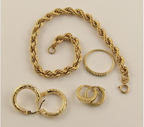 A 14ct rope chain bracelet, a 14ct diamond ring and two pairs of earrings