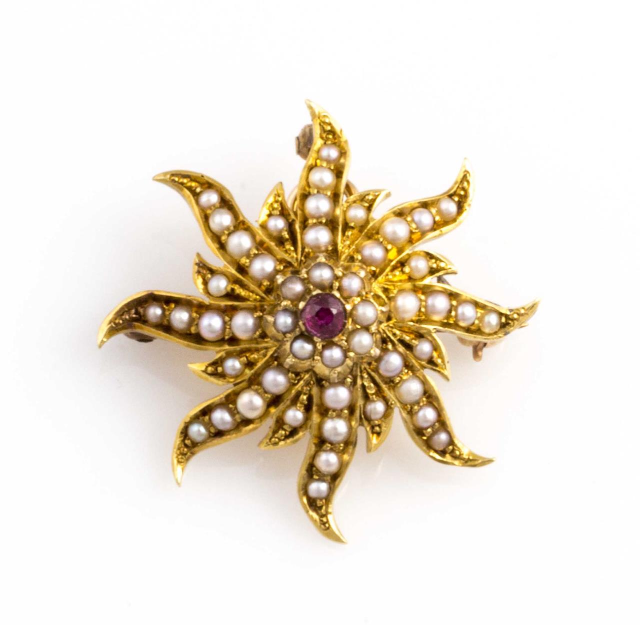 A 14kt yellow gold seed pearl and synthetic red stone brooch/pendant