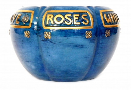A 1920s Royal Worcester Sabrina Porcelain jardiniere, the lobed body with relief moulded verse 'While ye may gather ye roses' in gilt to a blue tonal ground, printed mark with date code for 1926, height 18cm, diameter 26cm, S/D