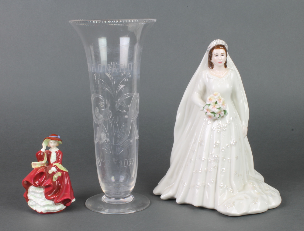 A 1937 commemorative Coronation tapered vase 10", a Royal Worcester figure Her Majesty Queen Elizabeth II and HRH Duke of Edinburgh Diamond Wedding anniversary 2007 9" and a Royal Doulton figure Top O'The Hill HN3499 4"