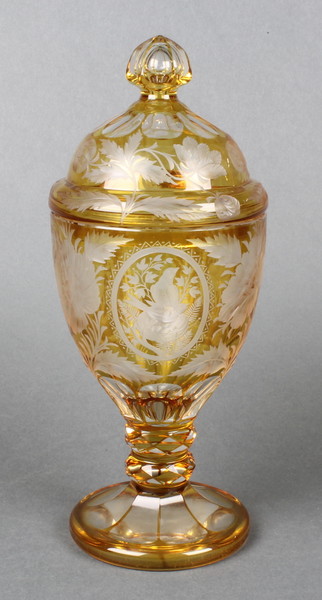 A 19th Century Bohemian flash glass vase and cover, the yellow ground with panels of birds amongst flowers