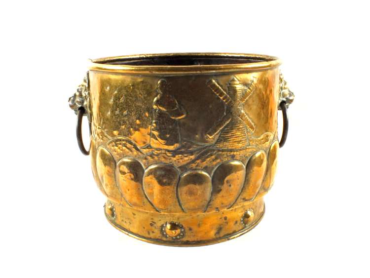 A 19th Century Dutch Brass log bin with lion ring handles and repousse boy and windmill decoration