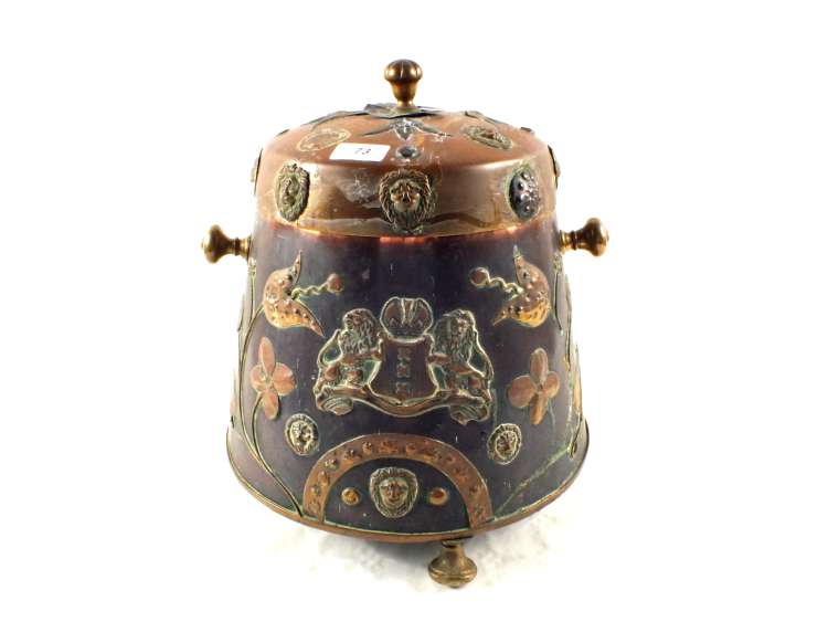 A 19th Century Dutch Copper and Brass peat or ember bucket applied with Amsterdam Coat of Arms, lion masks and flowering plants and having twin knob handles and three bun feet