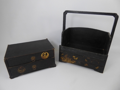 A 19th Century Japanese Handled Black Lacquered Carrying Box with three drawers depicting gilded floral decoration