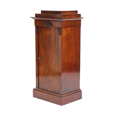 A 19th century Late-Empire mahogany cabinet, decorated with leaves and an eagle, front with drawer and door. H. 130. W. 63. D. 47 cm.
