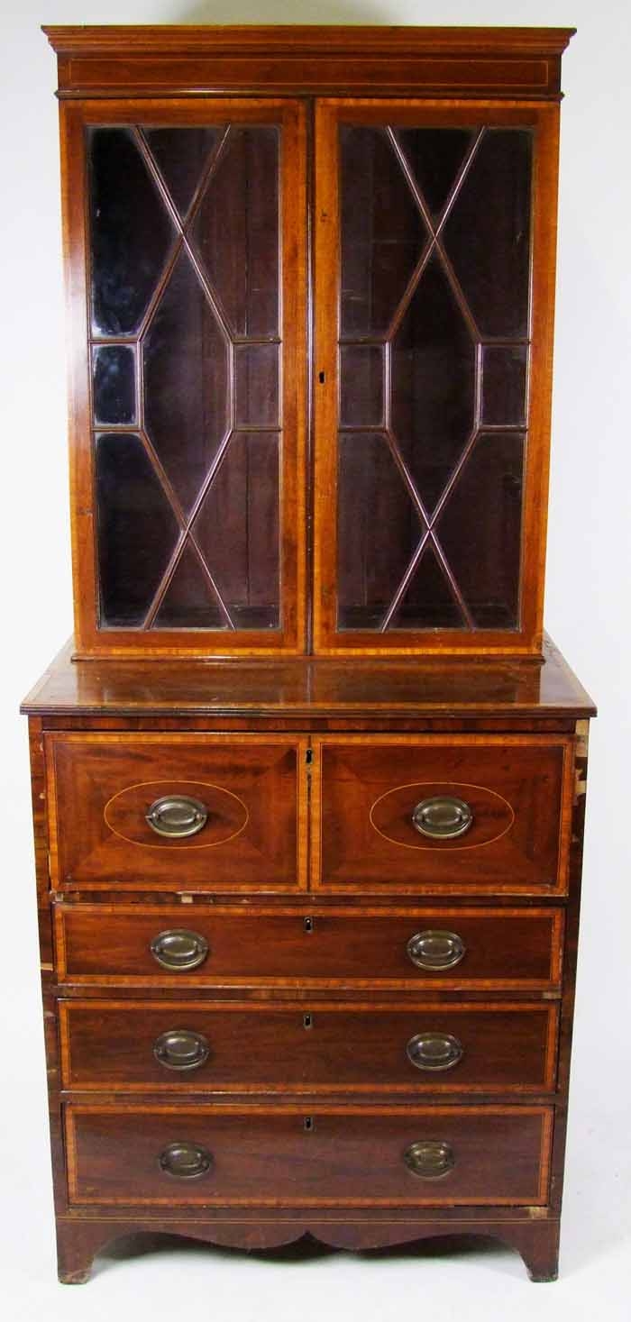 the upper section enclosed by a pair of astragal glazed doors, the fitted drawer over three long graduated drawers, on bracket feet,