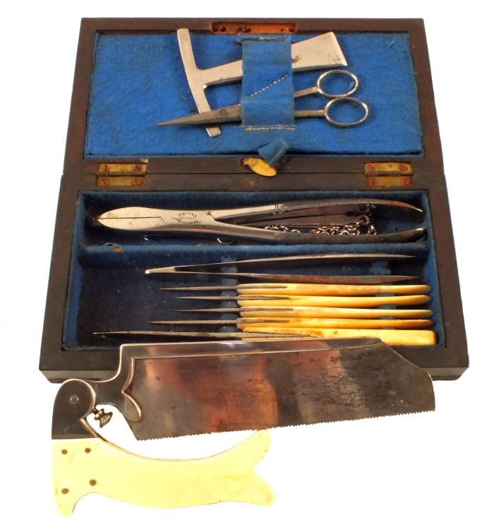 A 19th Century Mahogany cased surgeons kit including Ivory handled folding bone saw