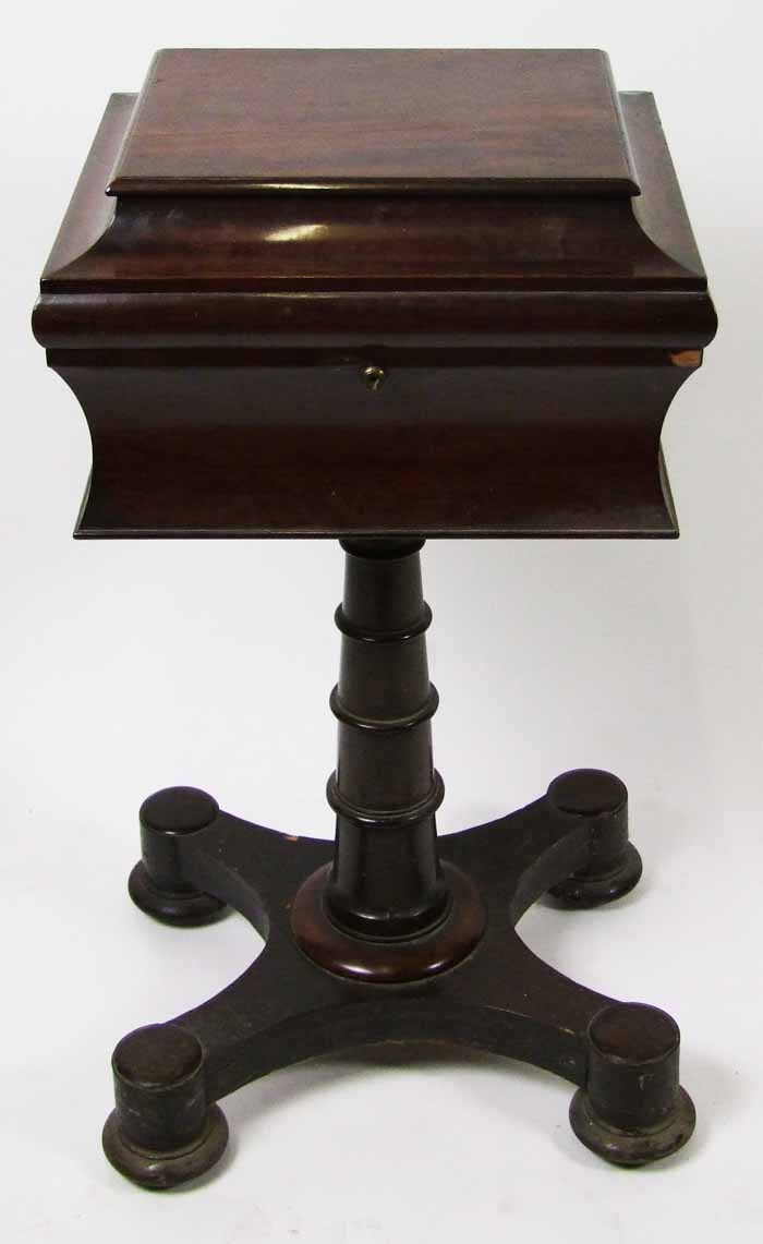 of waisted rectangular form, fitted with four lidded canisters, and two mixing bowl recesses, on a ring turned pedestal, quadruped base, turned feet