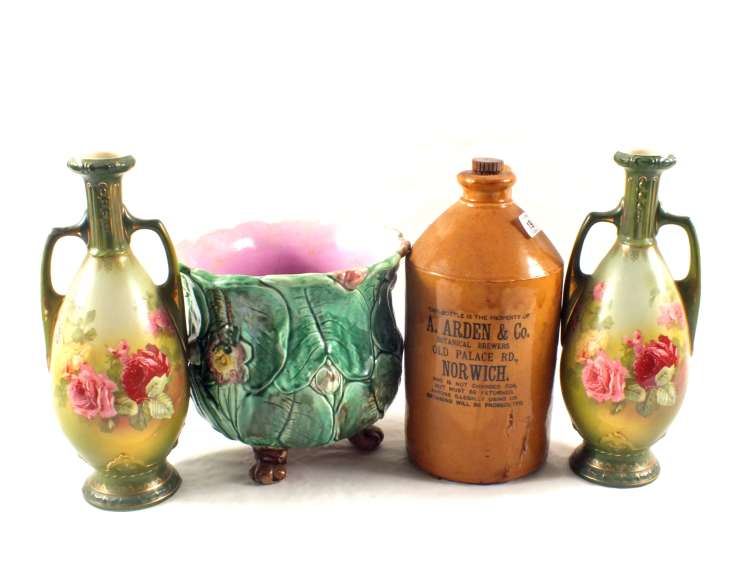 A 19th Century Majolica jardinière, a Victorian floral vase and an Arden, Norwich stoneware flagon