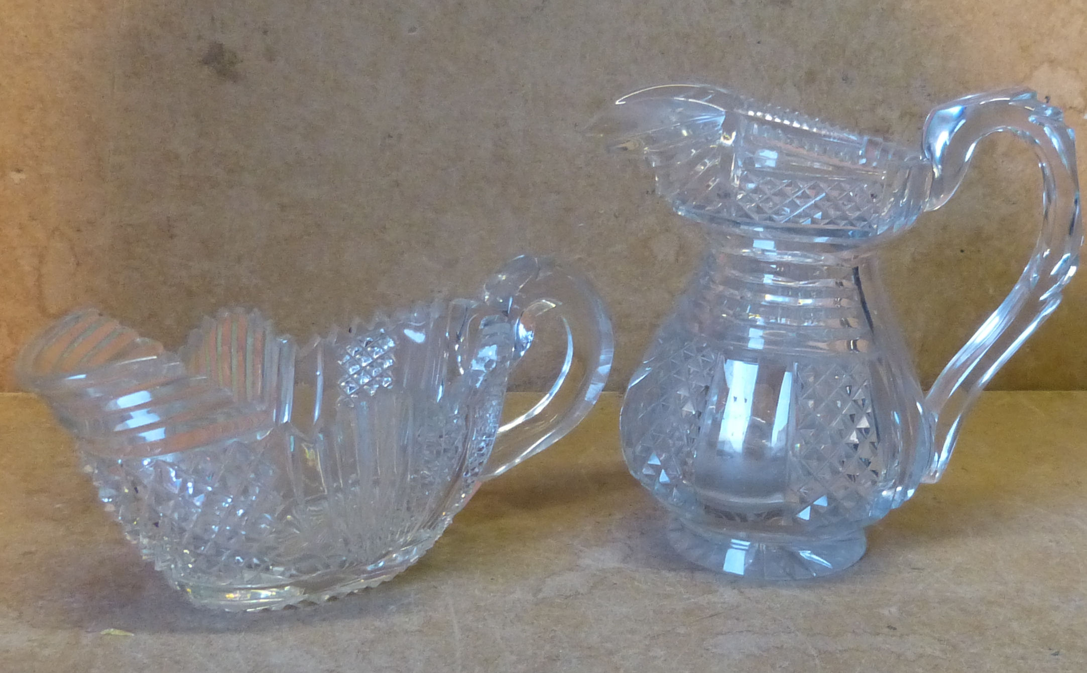 also a similar cut glass bulbous milk jug having tooth cut decoration