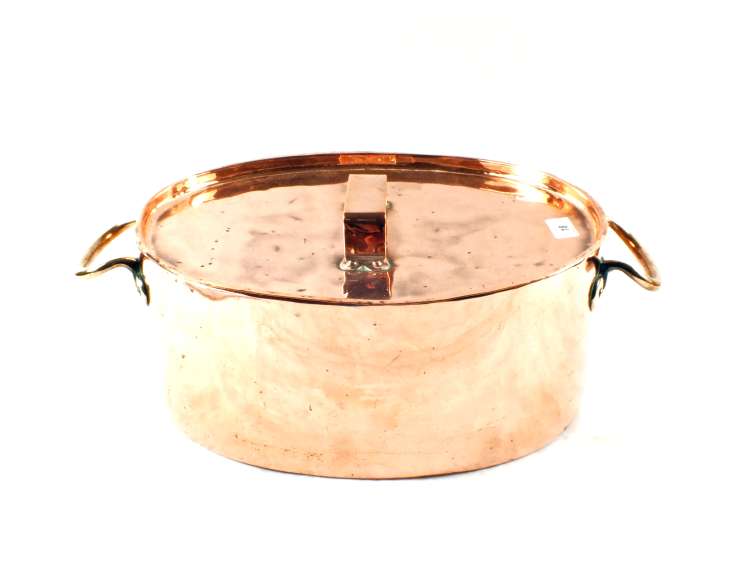 A 19th Century oval twin handled Copper fish kettle and cover, 20' wide overall