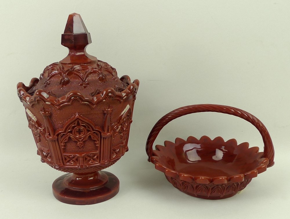 A 19th century pressed glass cup and cover in terracotta red, decorated in the Gothic manner, with trefoil arches, on pedestal base, 18cm, and a similar open basket posy bowl, 12 by 9cm. (2)