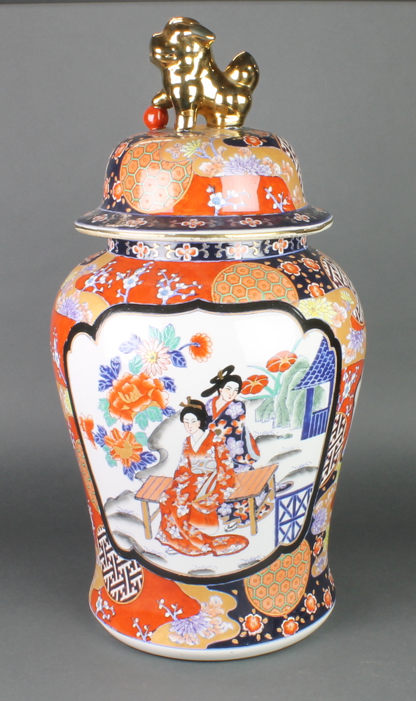 A 20th Century Imari baluster vase and cover decorated with panels of figures in garden landscapes on a ground of flowers, the lid with gilt shi shi finial 4"