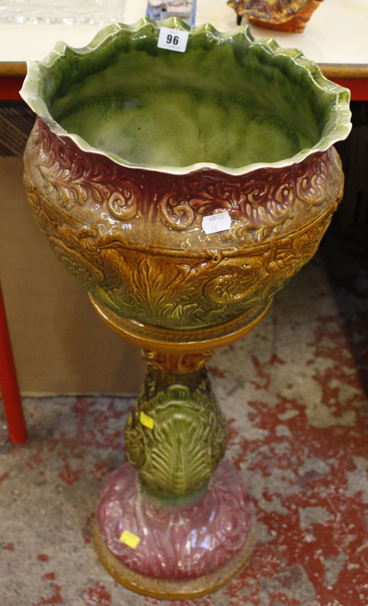 A 20th Century jardiniere on stand , 78cm high and a stoneware flagon (2)