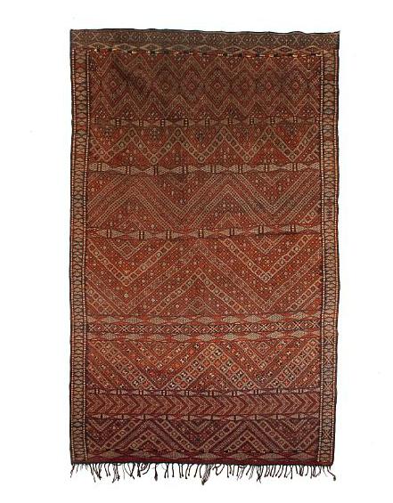 A 20th century Moroccan tapestry, embellished with repeating pattern on reddish base