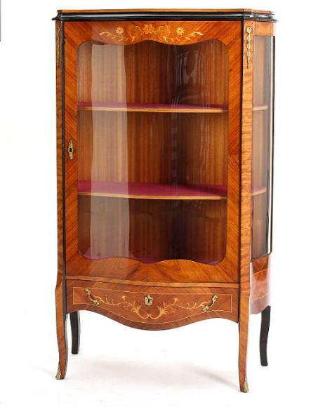 A 20th century Rococo style rosewood display cabinet, inlaid with foliage, bronze handles and mounts