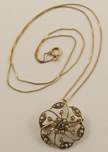 A 9ct Edwardian pendant brooch set with seed pearls and a blue gem stone, with a 9ct chain