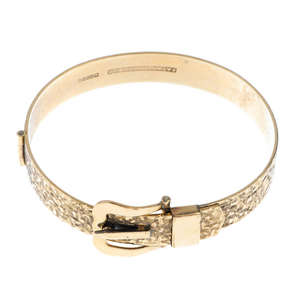 A 9ct gold bangle. Designed as a buckle, to the textured bangle. Hallmarks for Birmingham, 1979. Inner diameter 5.8cms. Weight 22.3gms.