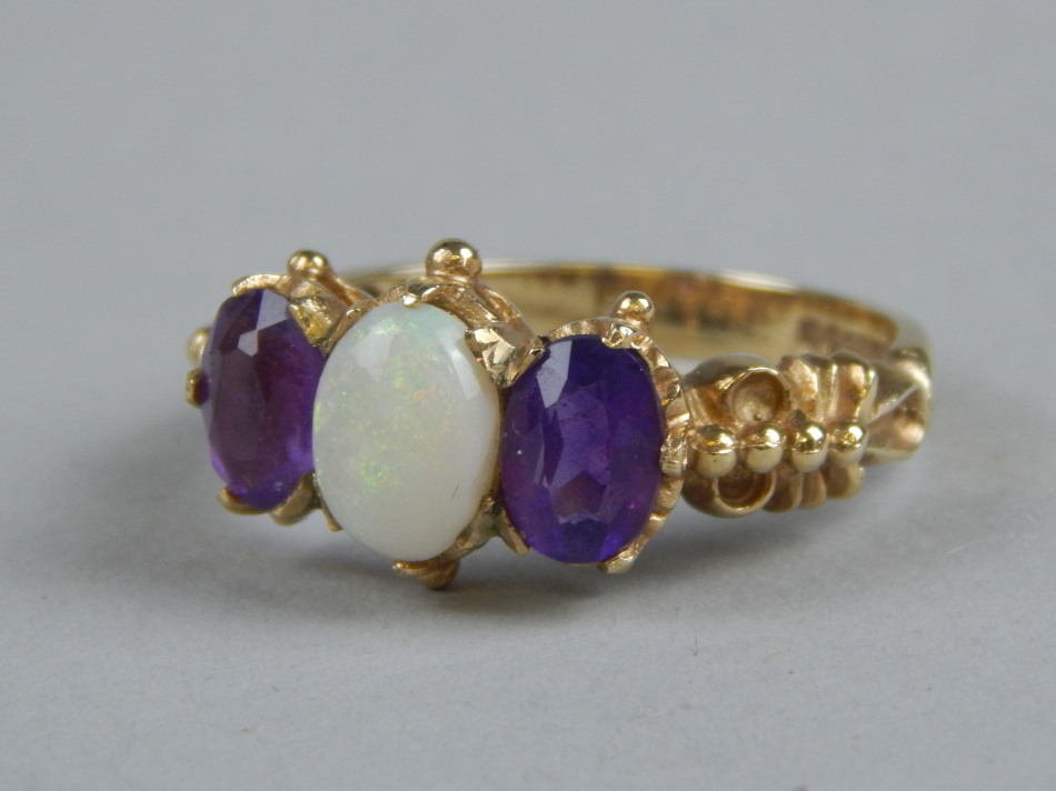 A 9ct gold dress ring, set with opal and two purple stones, 4.1g all in