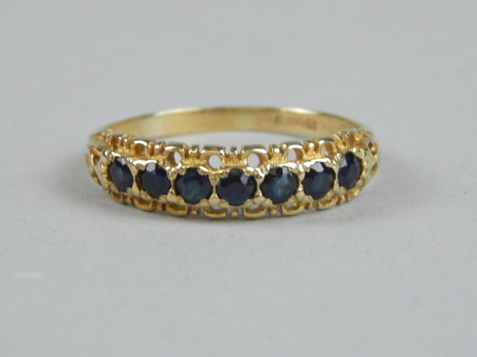 A 9ct gold dress ring, set with seven blue stones, 2.1g all in, boxed
