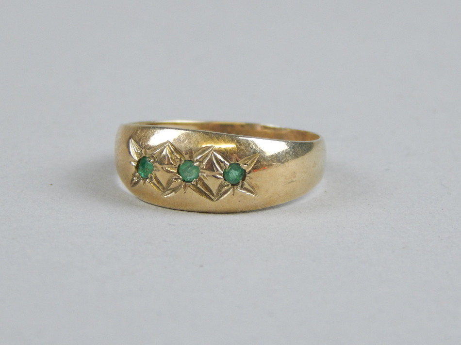 A 9ct gold dress ring, with green star set stones, 2.2g all in