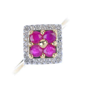 The circular-shape ruby quatrefoil and bead highlight, within a single-cut diamond surround, to the tapered shoulders and plain band. Hallmarks for Birmingham. Ring size N. Weight 2.4gms.