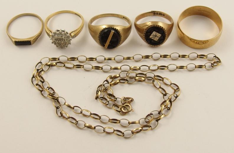 A 9ct wedding band, three 9ct onyx rings, a 9ct diamond ring and a 9ct chain approx weight 18.3gms