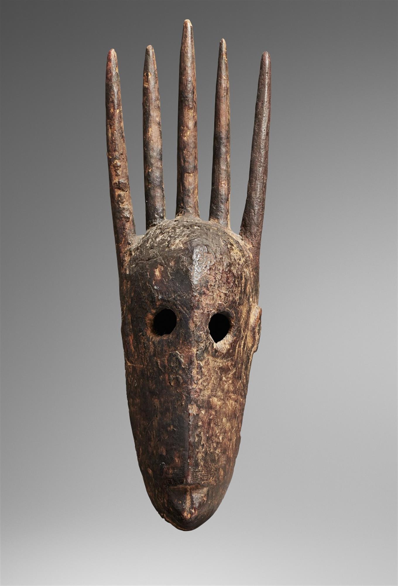 The face with pierced circular eyes, surmounted by five long projections, dark encrusted patina.