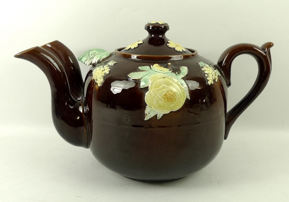 A Bargeware two spout teapot decorated with roses, fruiting vines and leaves