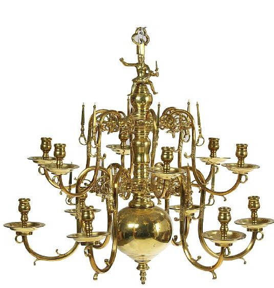 A Baroque brass chandelier, 12 branches in two levels