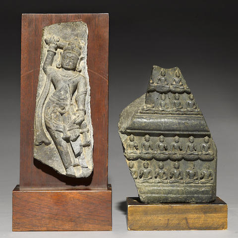 Depicting repeated figures of Amitabha, Akshobhya, Ratnasambhava, and Amoghasiddhi in distinct rows from top to bottom; together with a North Indian sandstone carving of an attendant (losses).