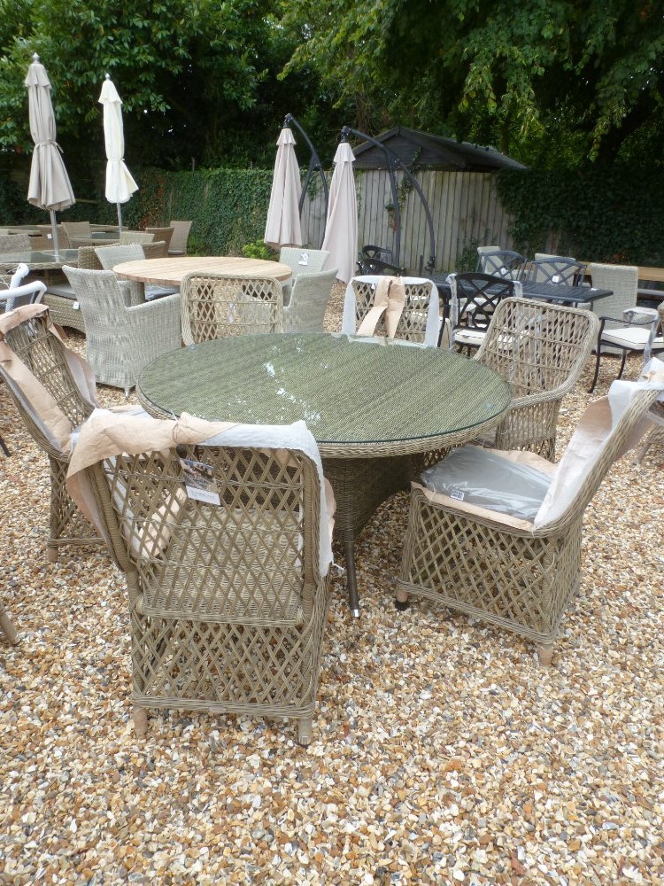 A Bramblecrest Foxham 150cm table with two armchairs and four side chairs and cushions