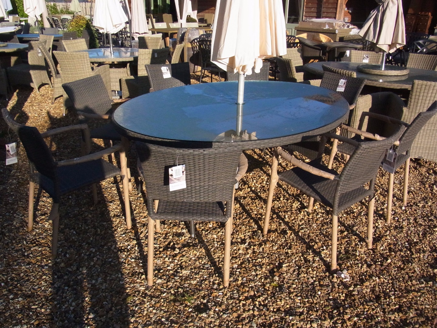 A Bramblecrest Rio oval table with eight stacking armchairs, parasol and base