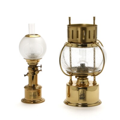 A brass and glass frigate lampe and a lightship oil lamp.