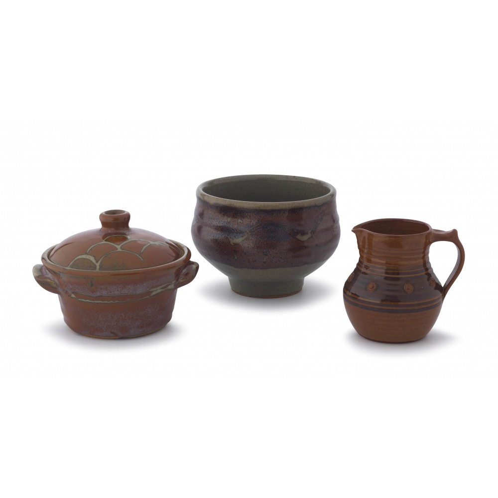 14,5cm high; a brown-glazed casserole dish and cover, impressed initials, chip, 20,5cm wide over handles; and a brown-glazed earthenware jug, the shoulder applied with circular bosses, 14cm high