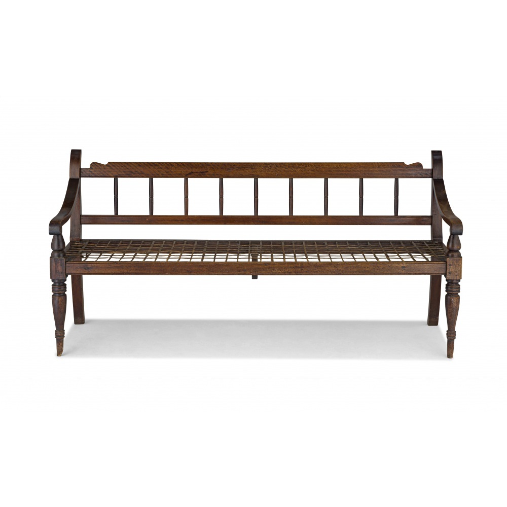 the carved top rail above a reeded bottom rail joined by nine spindles between carved supports, downcurved arms on baluster supports, riempie seat, raised on turned tapering legs, 174cm long
