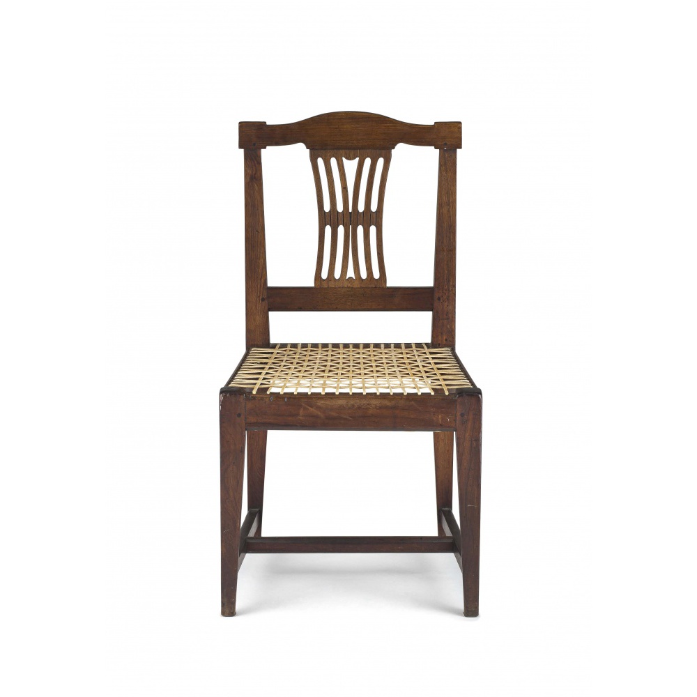 the curved top rail and plain bottom rail joined by a pierced double fan-shaped splat between square-section supports, the reverse of the bottom rail carved with the name MC Swart, riempie seat, raised on square-section tapering legs joined by an H-s