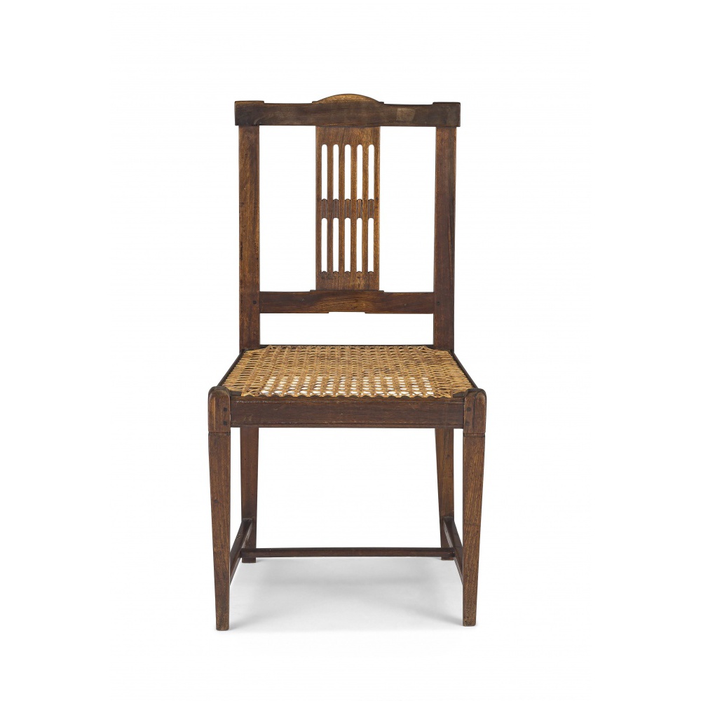 the square-section top rail centered by an arch above a pierced splat, carved bottom rail, between tapering square-section supports, caned seat, on square-section tapering legs joined by an H-stretcher